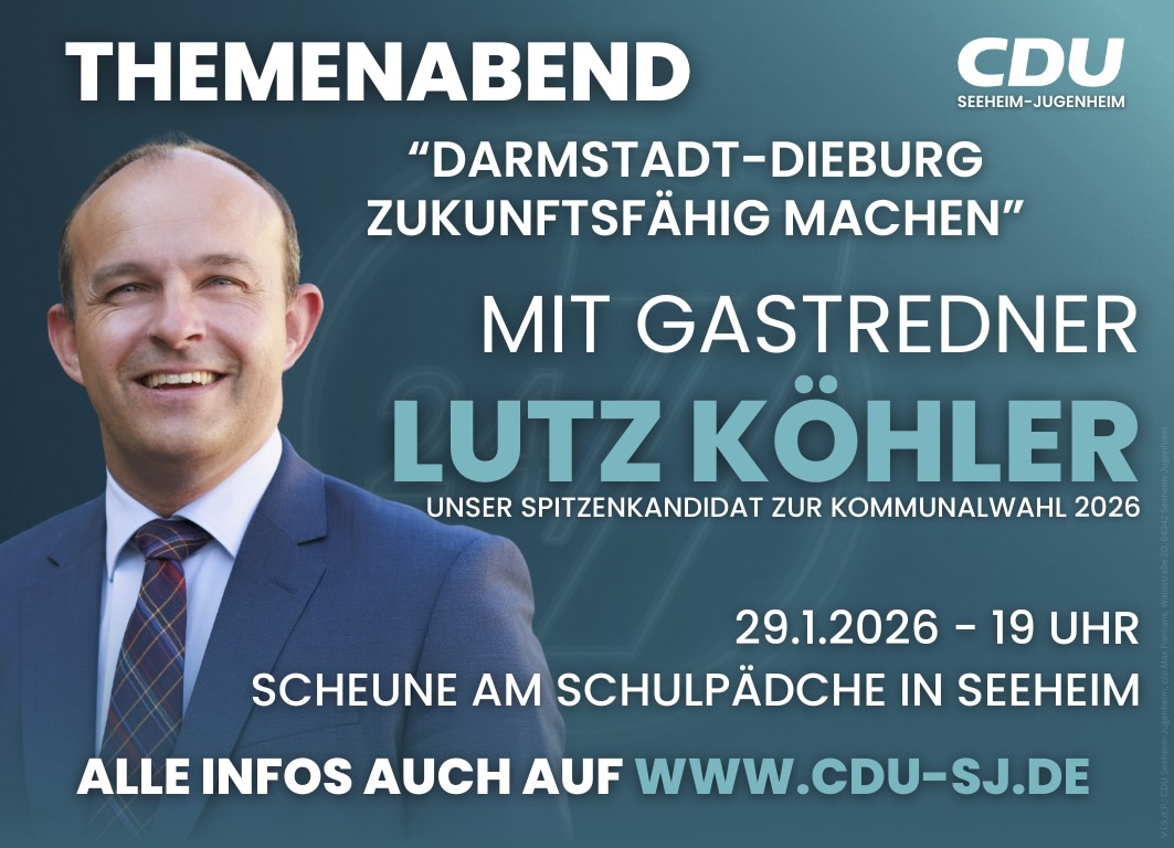 Die CDU Seeheim-Jugenheim lädt alle Interessierten am Donnerstag, den 29.1.2026 um 19 Uhr in die Scheune am Schulpädche zu einem Themenabend ein. Gastredner wird Lutz Köhler, der Spitzenkandidat zur Kreistagswahl am 15. März sein.