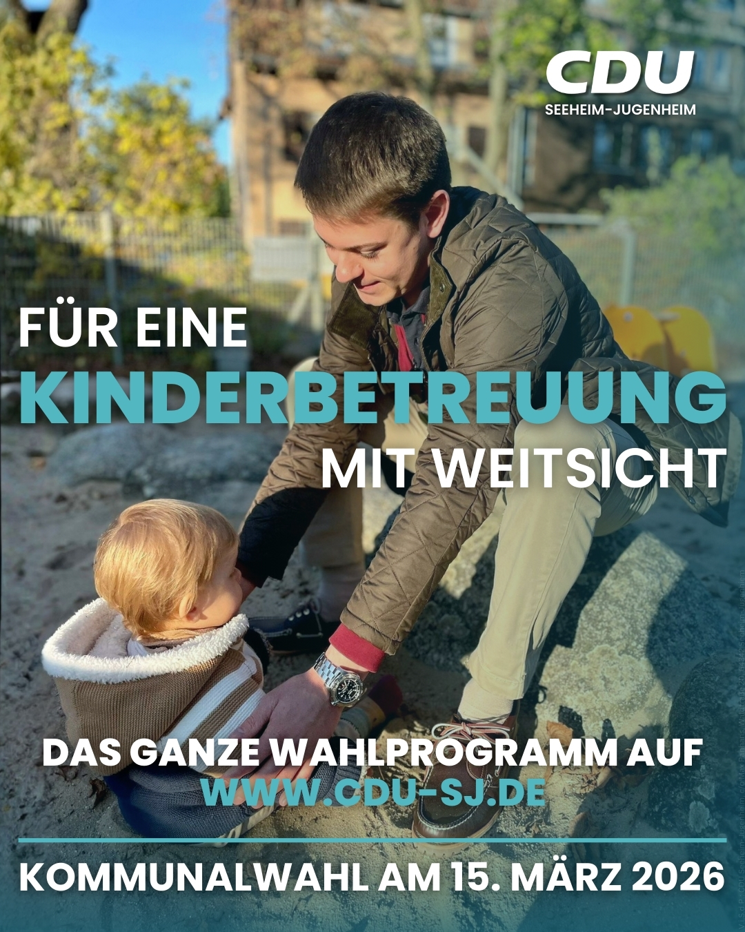 Die CDU Seeheim-Jugenheim setzt sich mit Nachdruck für eine vorausschauende und verlässliche Planung der Kinderbetreuung in der Gemeinde ein. Ziel sei es, jedem Kind in Seeheim-Jugenheim einen Betreuungsplatz anbieten zu können und Eltern eine verlässliche Betreuung zu gewährleisten, als wesentliche Grundlage für die Vereinbarkeit von Familie und Beruf.