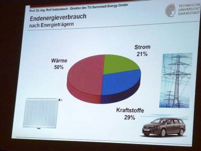 Bei den Haushalten benötigte man 77 % der Energie für das Heizen und das Warmwasser mit 11 %. Es folgten die Elektrogeräte mit 7 % und das Kochen mit 4 %. Das Schlusslicht bildete die Beleuchtung mit 1 %. Hier könne man den Erfolg des Verbotes der Glühbirne sehen.