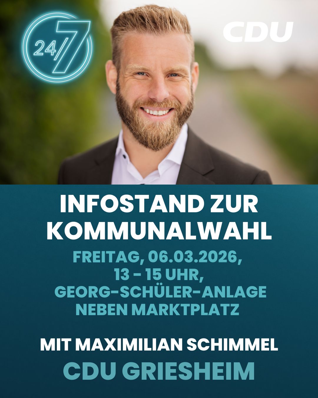 "Die Griesheimer CDU lädt zum traditionellen Neujahrsempfang am Donnerstag, 22. Januar 2026 um 18.30 Uhr (Einlass) - 19.00 Uhr (Beginn) in das Caféhaus Waldeck, Eichendorffstr. 50 in Griesheim ein. Hierbei werden wir Mitgliederehrungen durchführen sowie die Kommunalwahl am 15. März 2026 in den Fokus nehmen" kündigt der Vorsitzende Björn Cappai an.