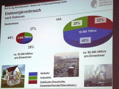Im Schnitt verbrauchte jeder Deutsche 30.500 kWh im Jahr gegenüber 62.000 kWh jeden US-Bürgers. Ohne die Verluste gesehen würden in Deutschland 44 % der Energie in Gebäude gehen, in den Verkehr 29 % und die Industrie 27 %.
