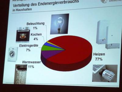Bei den Haushalten benötigte man 77 % der Energie für das Heizen und das Warmwasser mit 11 %. Es folgten die Elektrogeräte mit 7 % und das Kochen mit 4 %. Das Schlusslicht bildete die Beleuchtung mit 1 %. Hier könne man den Erfolg des Verbotes der Glühbirne sehen.
